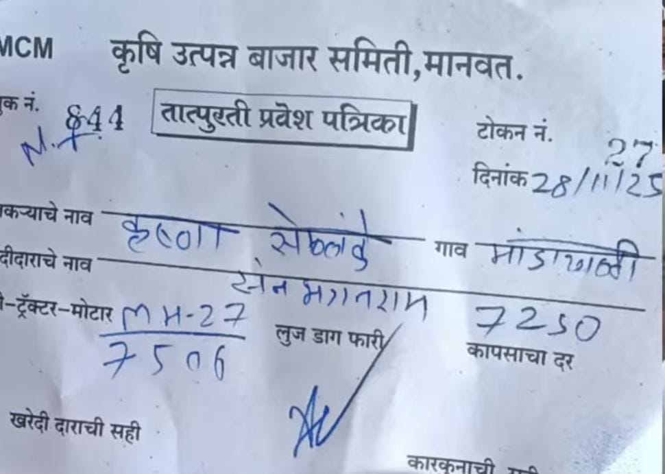 मानवत येथे आजचा सर्वाधिक भाव 7,200 रुपये प्रति क्विंटल लागल्याची नोंद झाली असून, संबंधित पावती आणि ईतर पावत्या खाली दिल्या आहेत.